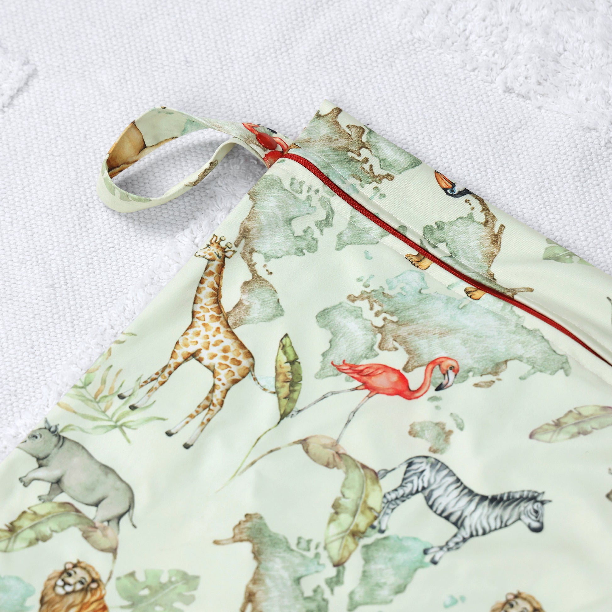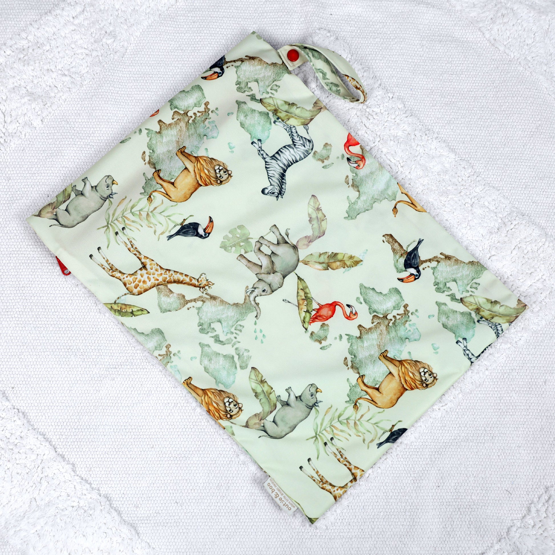 Our wet bags are made of waterproof fabric with one-of-a-kind, hand-drawn designs, making them perfect for storing damp (but not overly wet) costumes, clothes, and diapers before washing. Additionally, these bags can be utilized when traveling to the beach or pool, as they protect items inside from any moisture.