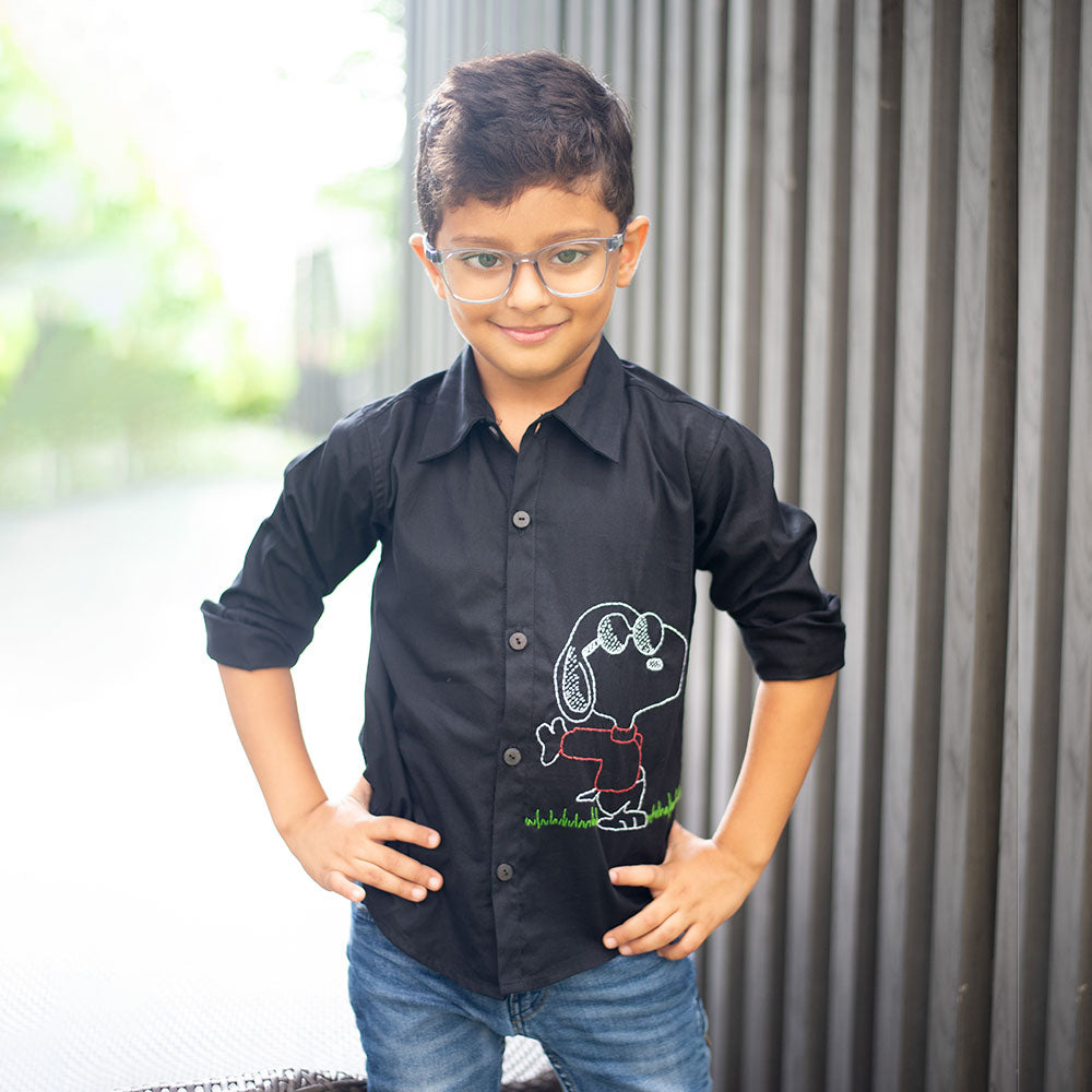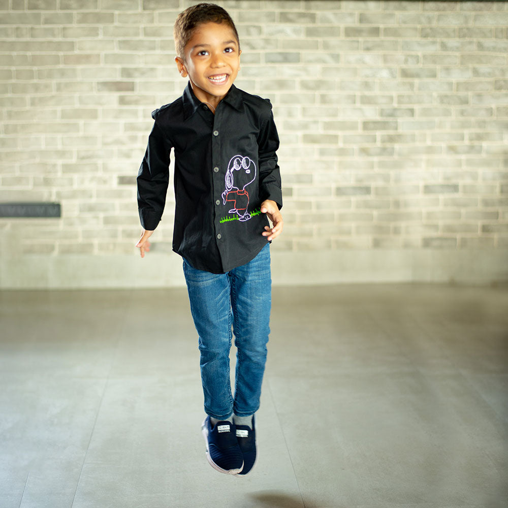 Laid-back vibes only! This cool black shirt features a relaxed hand-embroidered Snoopy just doing his thing — chilling in style. Made with breathable organic cotton, it’s perfect for playdates, picnics, and everything in between.
