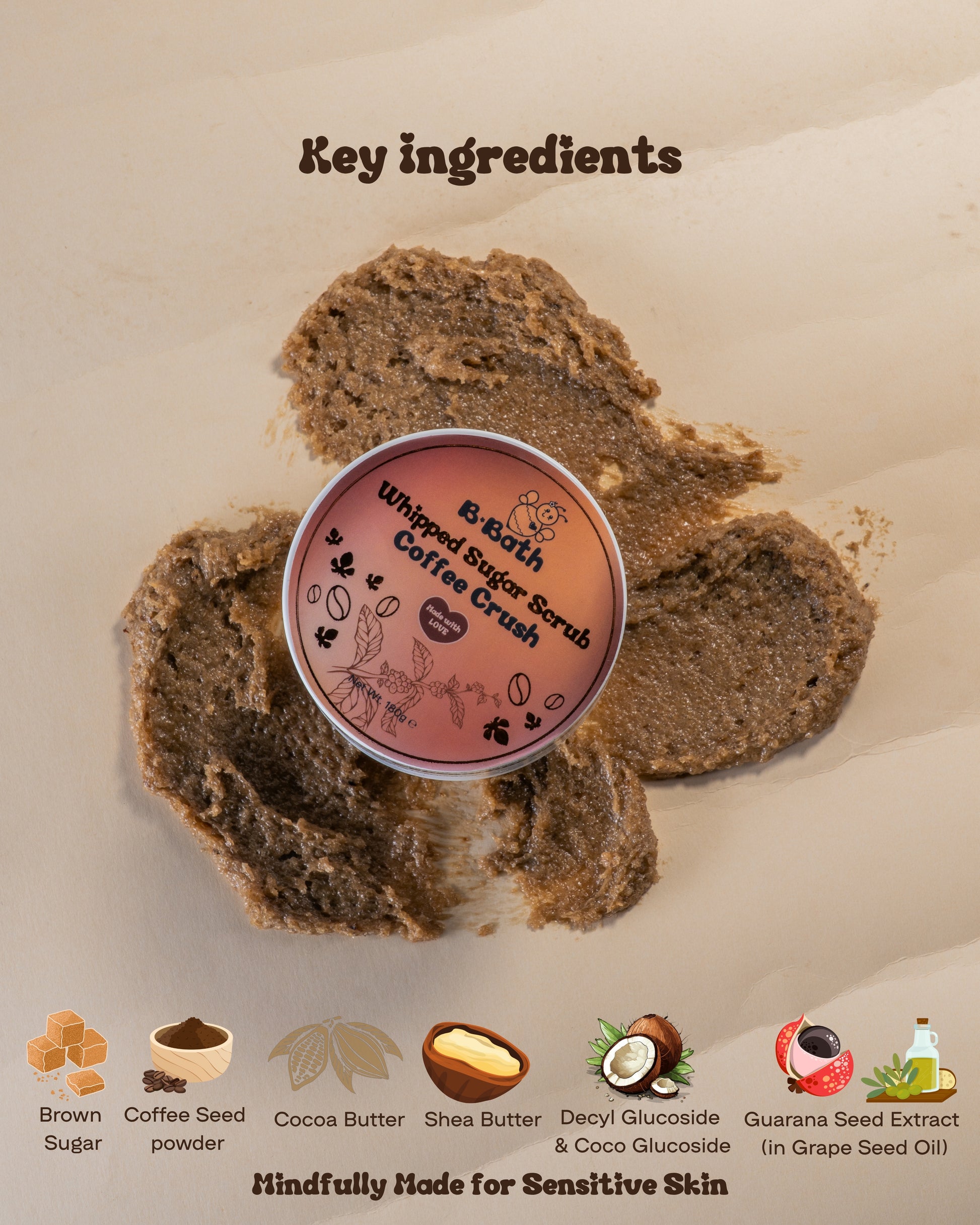 Key Ingredients: Brown Sugar (Sucrose), Coffee Seed Powder (Arabica), Cocoa Seed Butter (Theobroma Cacao), Shea Butter, Decyl Glucoside & Coco Glucoside and Guarana Seed Extract (in Grape Seed Oil)