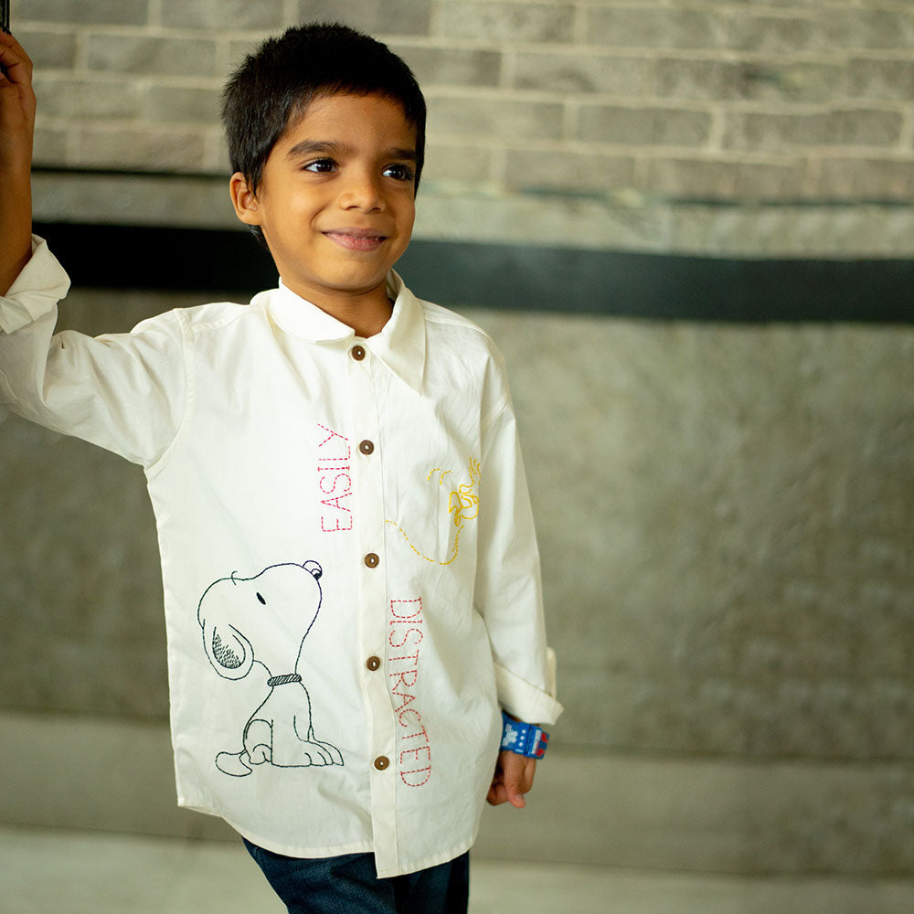 Soft, comfy, and full of character Š—– this white shirt features a hand-embroidered Snoopy who is Š—“Easily DistractedŠ—� and Woodstock buzzing above. A fun pick for curious minds and little daydreamers!
