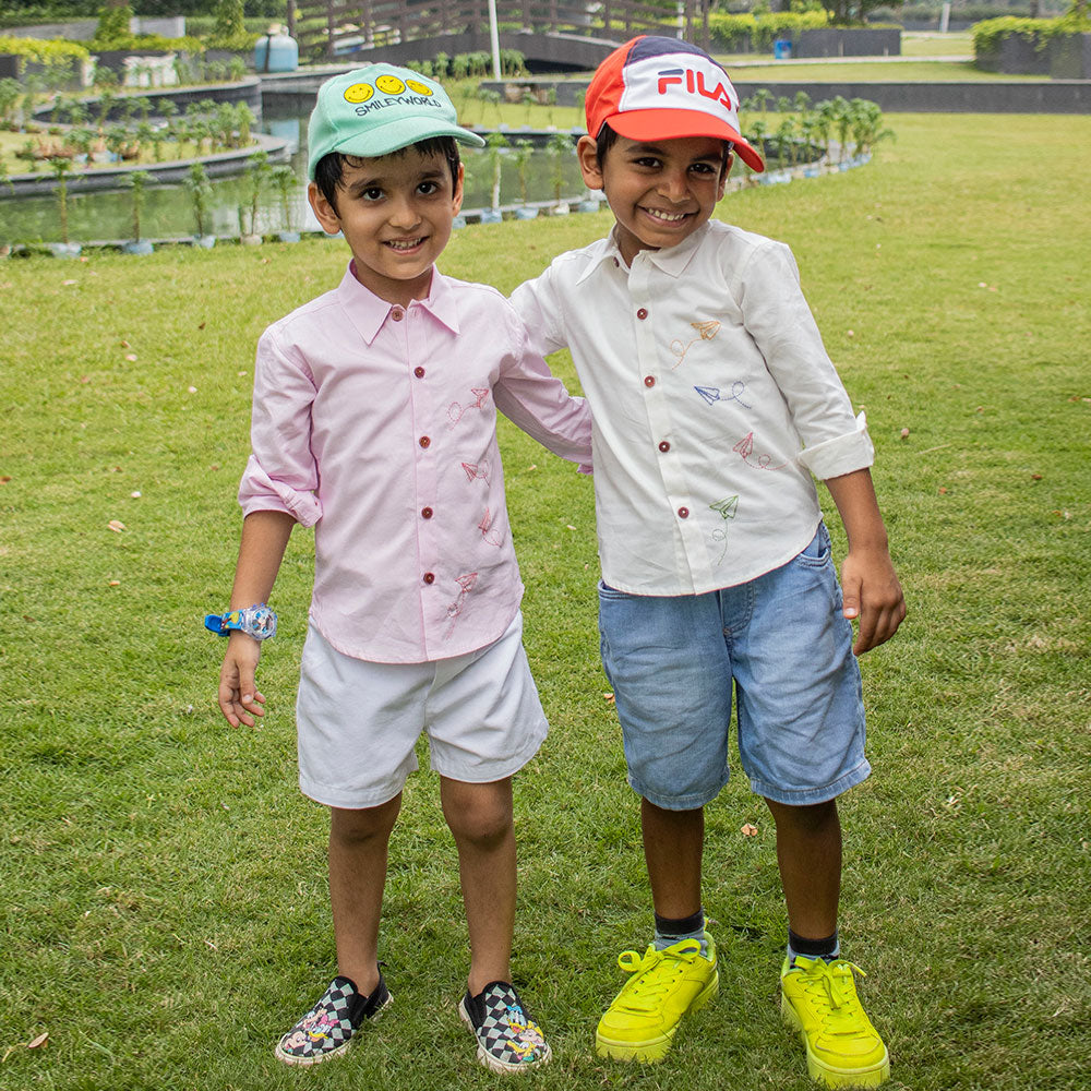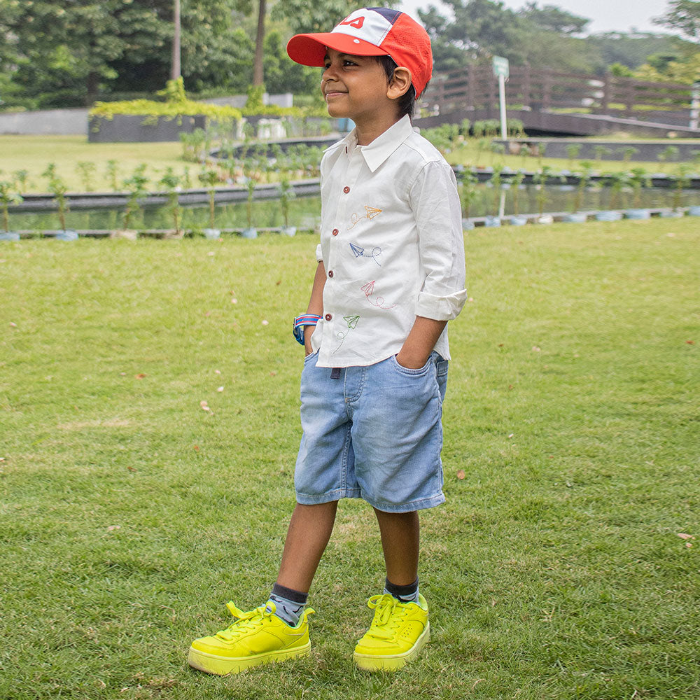 Our classic Frost shirt with a cute hand embroidered multi coloured planes will surely be your little ones new favourite for casual parties. Roll up the sleeves or keep them crisp straight, jeans or trousers, stylize it your way for a casual outings or a day party. Designed with a shirt collar, button placket and long sleeves, this shirt is made of 100% organic cotton for uber comfort.