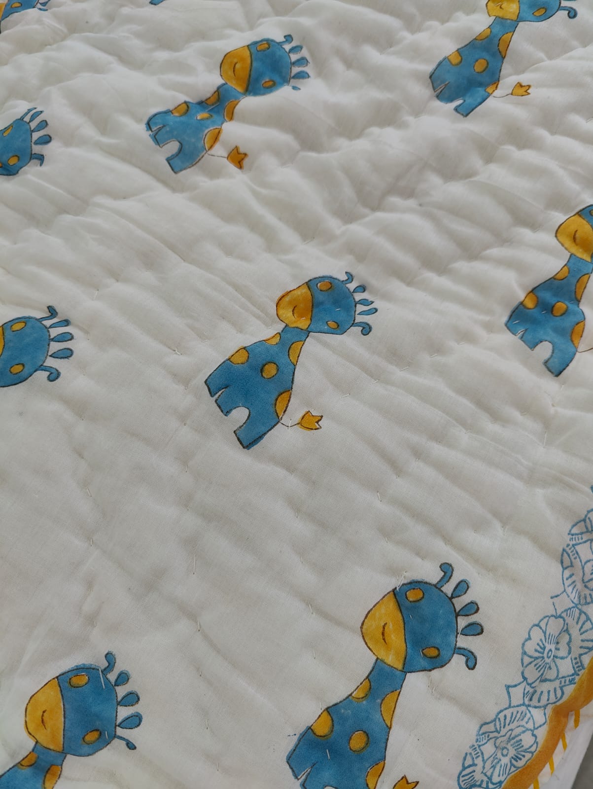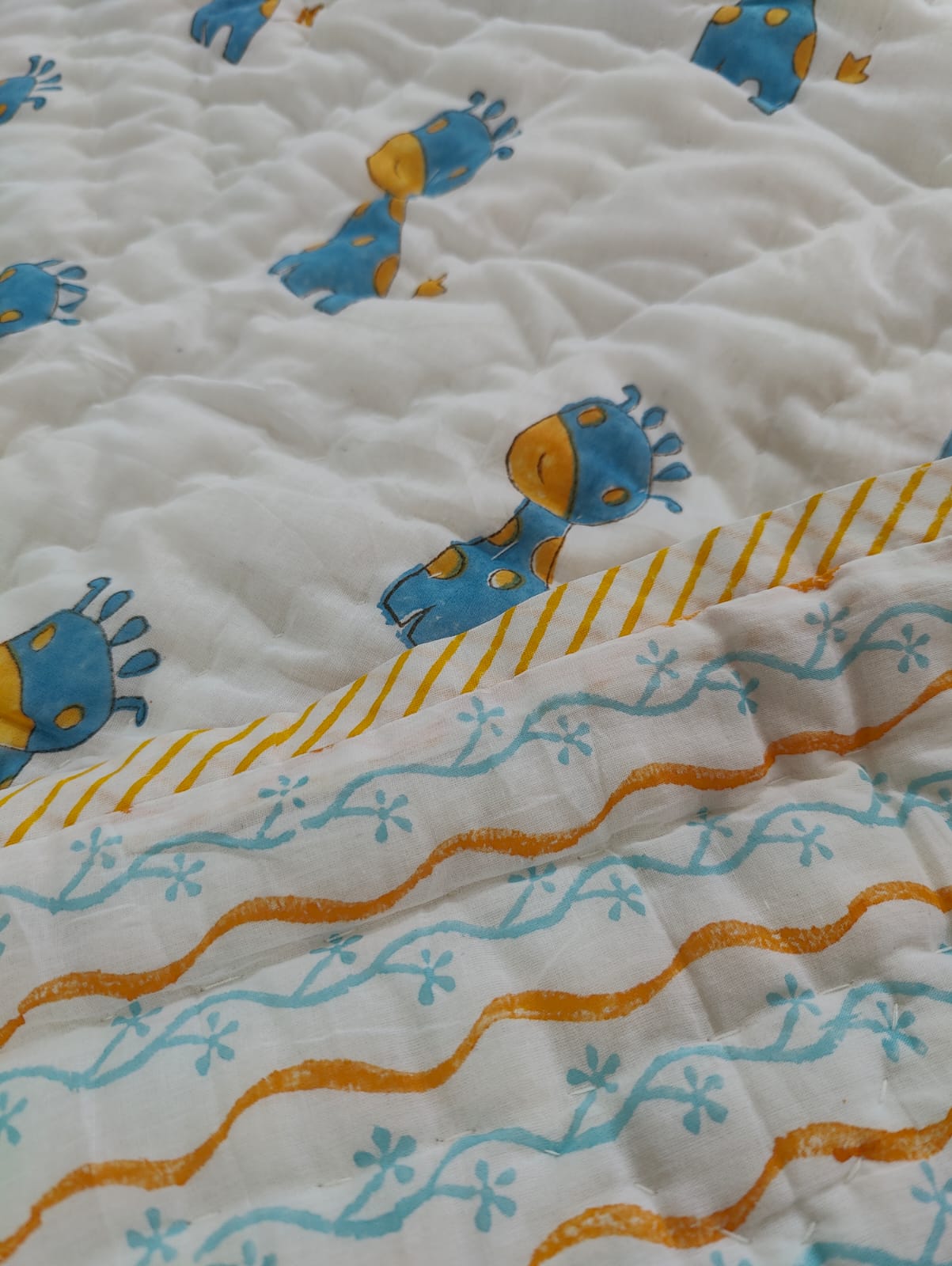 Our products are handblock printed on 100% premium cotton. Organic cotton filling used. Handcrafted in India using low impact dyes and breathable fabrics.