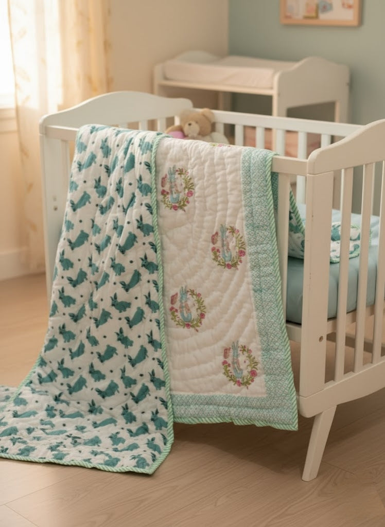 Our products are handblock printed on 100% premium cotton. Organic cotton filling used. Handcrafted in India using low impact dyes and breathable fabrics.
