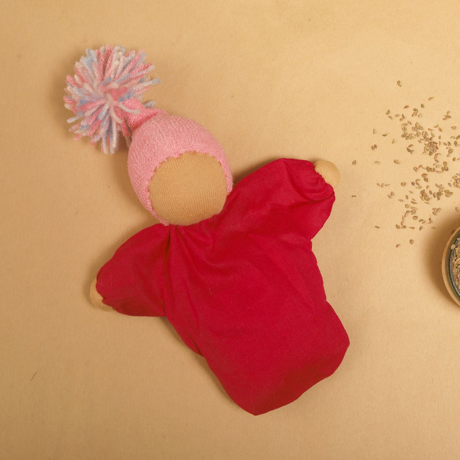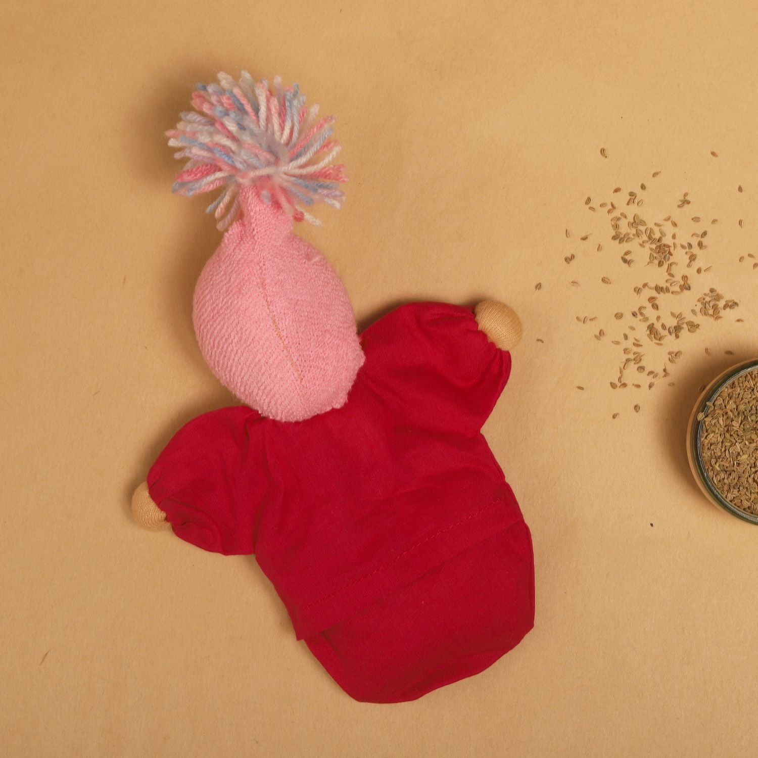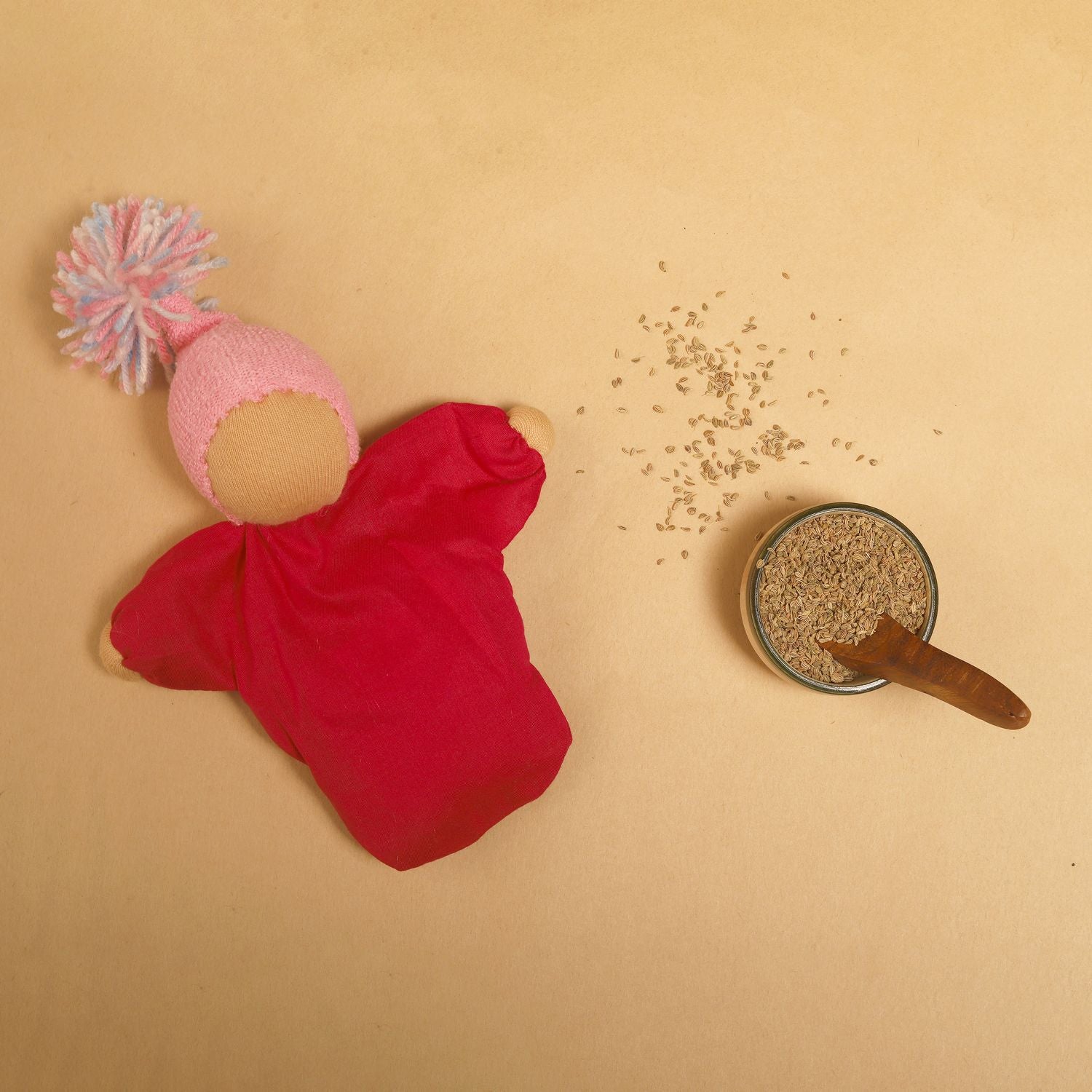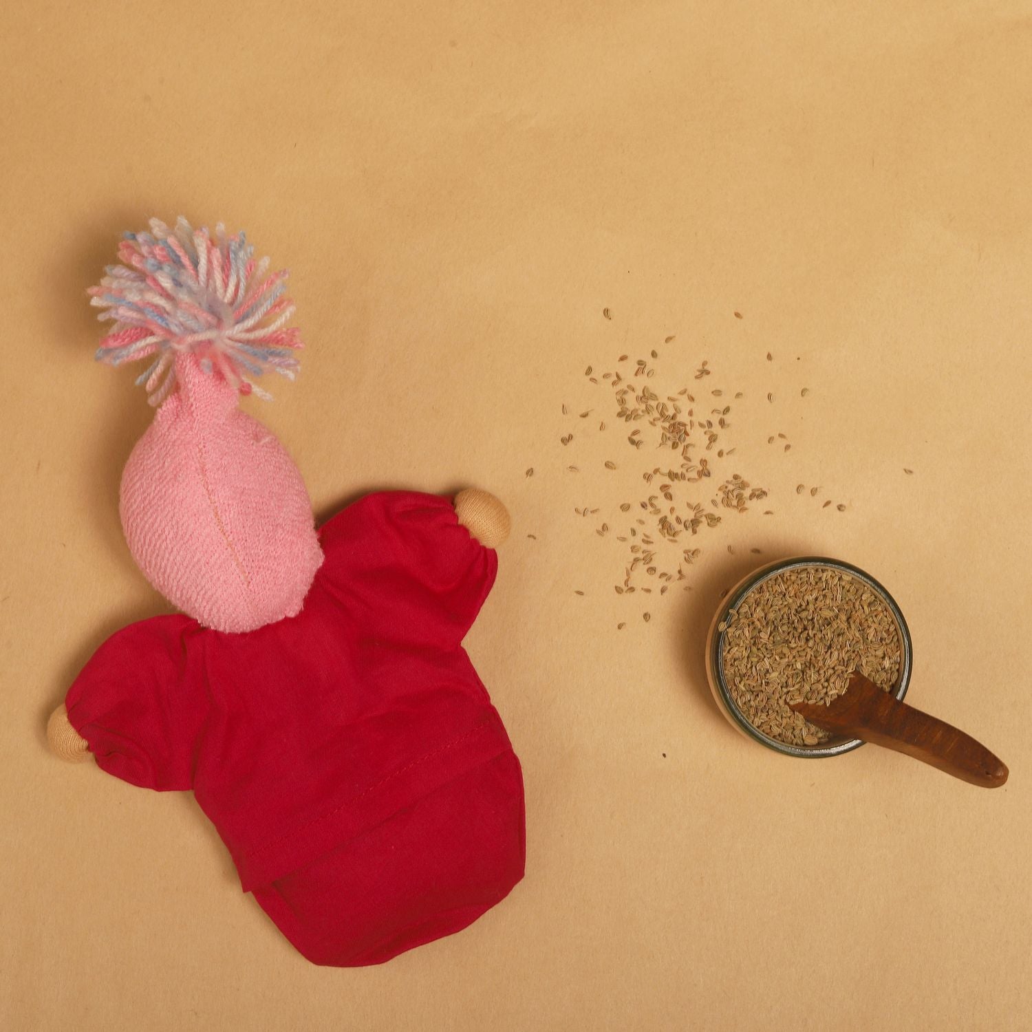 Hand-stitched comfort dolls for kids are filled with the goodness of Ajwain. These dolls are a great pick for kids to improve sensory development. Heat the Ajwain Potli/Pouch in the microwave for 10 seconds and place it back in the doll to keep it next to your baby's head for the baby to inhale the aroma of Ajwain seeds. Alternatively, you can compress it on your baby's chest with the same(please ensure you place it on the top of your hand to check the temperature), it should be warm, not hot. (as warm as the water that you give them a bath with). You can also keep a warm iron on the Ajwain Potli / pouch for 5 seconds to warm it and to be used in the same way as mentioned above. You will receive: One comfort doll with one ajwain filled pouch. To be stored in an airtight container to maintain hygiene and effectiveness of Ajwain (carom seeds). Please remove the ajwain (carom seeds) pouch and then hand wash with mild baby wash liquid. You would want to just spot clean if dirty or stained. DO NOT MACHINE WASH