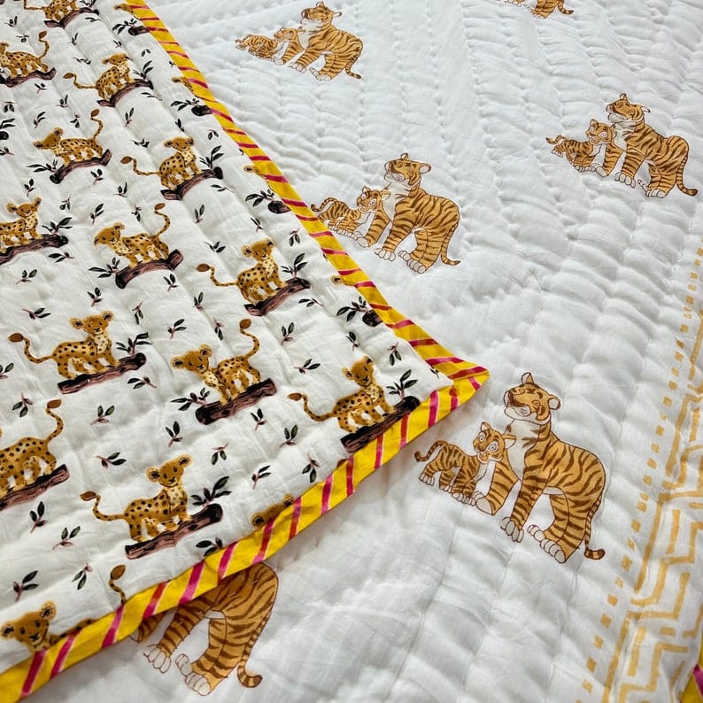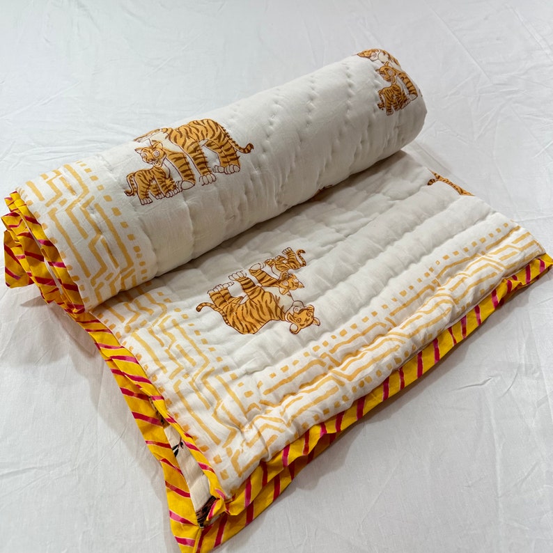 Our products are handblock printed on 100% premium cotton. Organic cotton filling used. Handcrafted in India using low impact dyes and breathable fabrics.