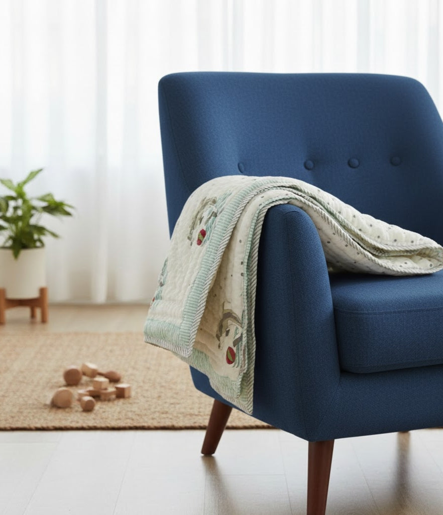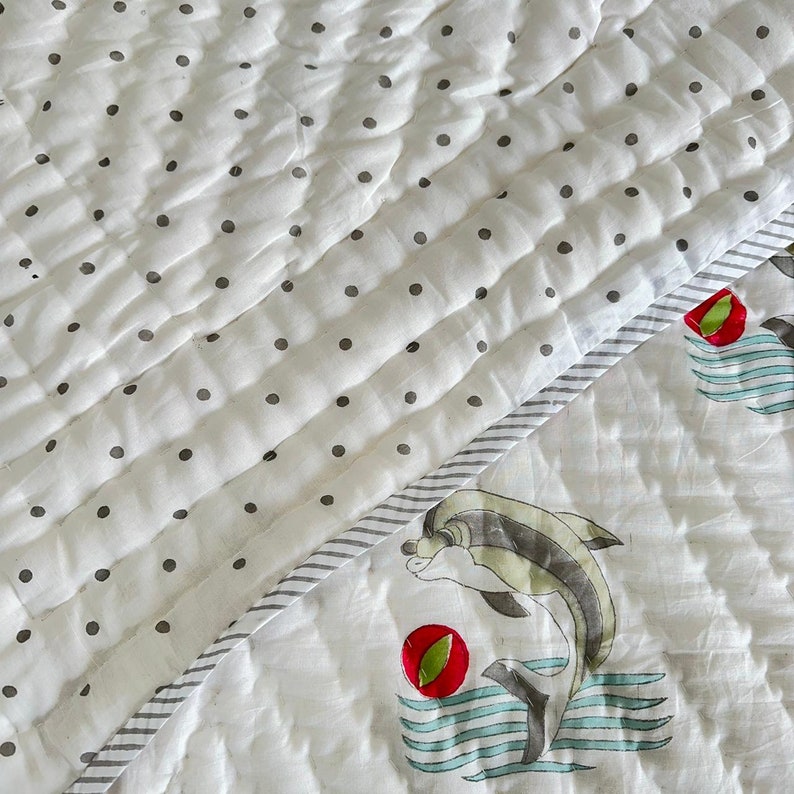 Our products are handblock printed on 100% premium cotton. Organic cotton filling used. Handcrafted in India using low impact dyes and breathable fabrics.