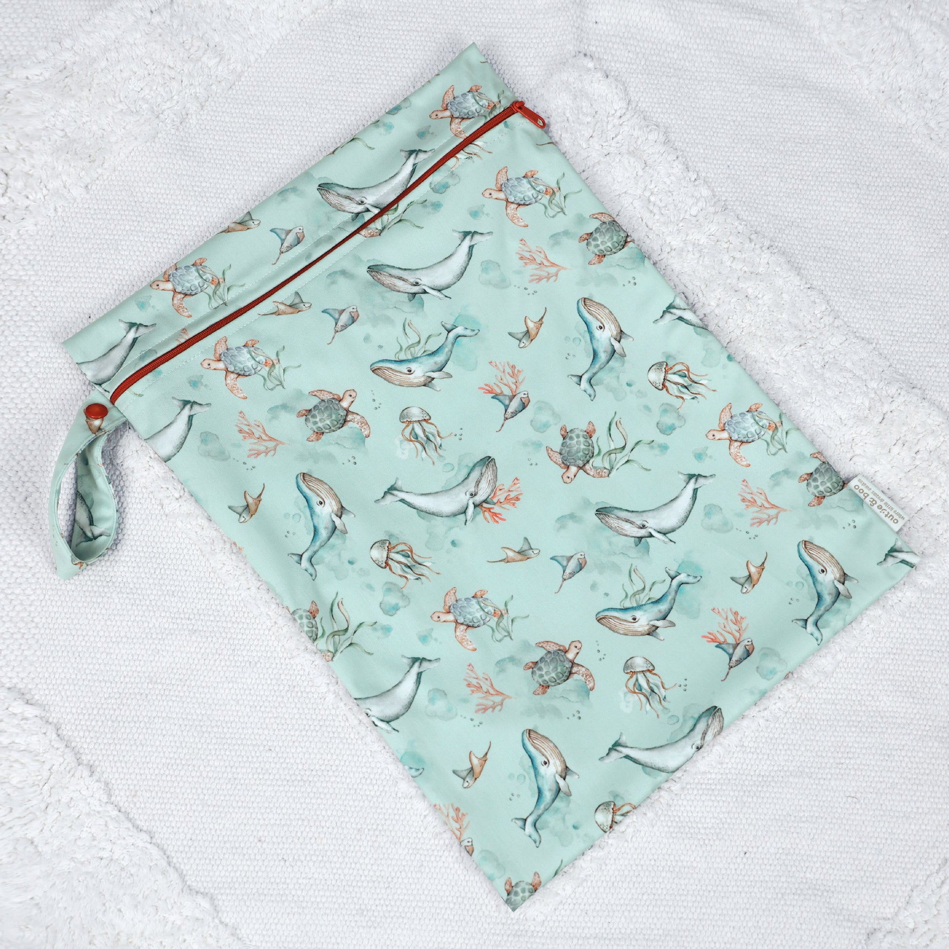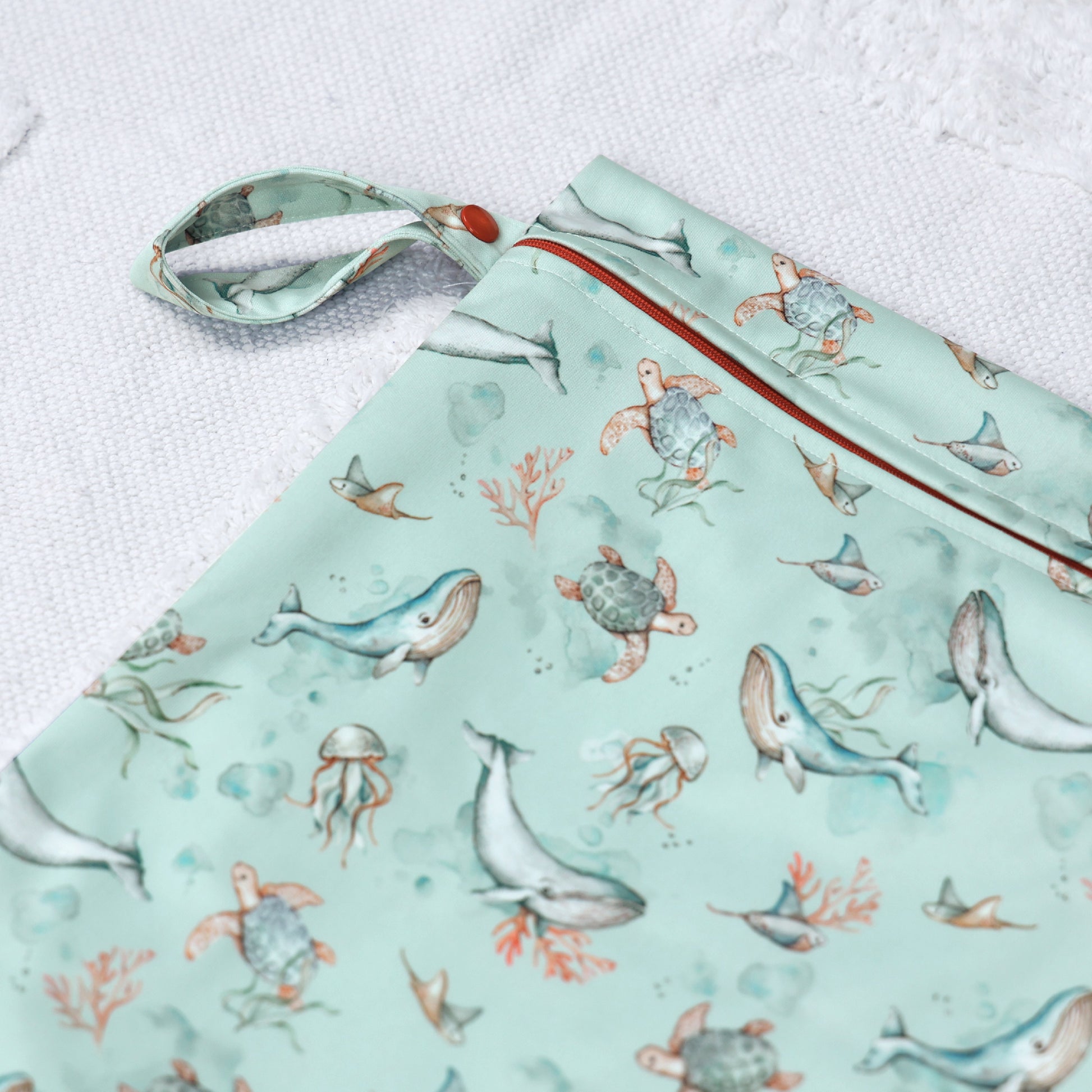 Our wet bags are made of waterproof fabric with one-of-a-kind, hand-drawn designs, making them perfect for storing damp (but not overly wet) costumes, clothes, and diapers before washing. Additionally, these bags can be utilized when traveling to the beach or pool, as they protect items inside from any moisture.