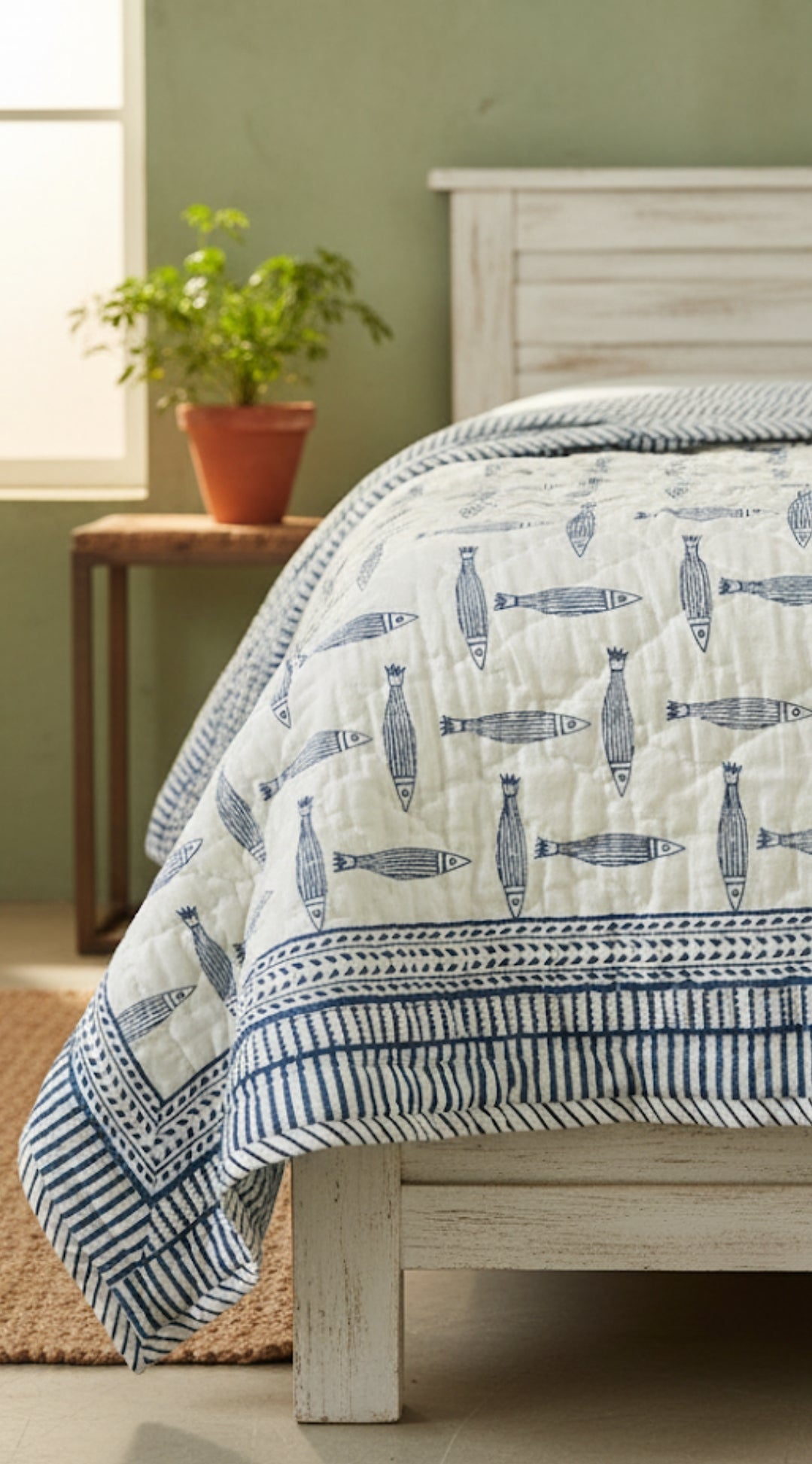 Our products are handblock printed on 100% premium cotton. Organic cotton filling used. Handcrafted in India using low impact dyes and breathable fabrics.