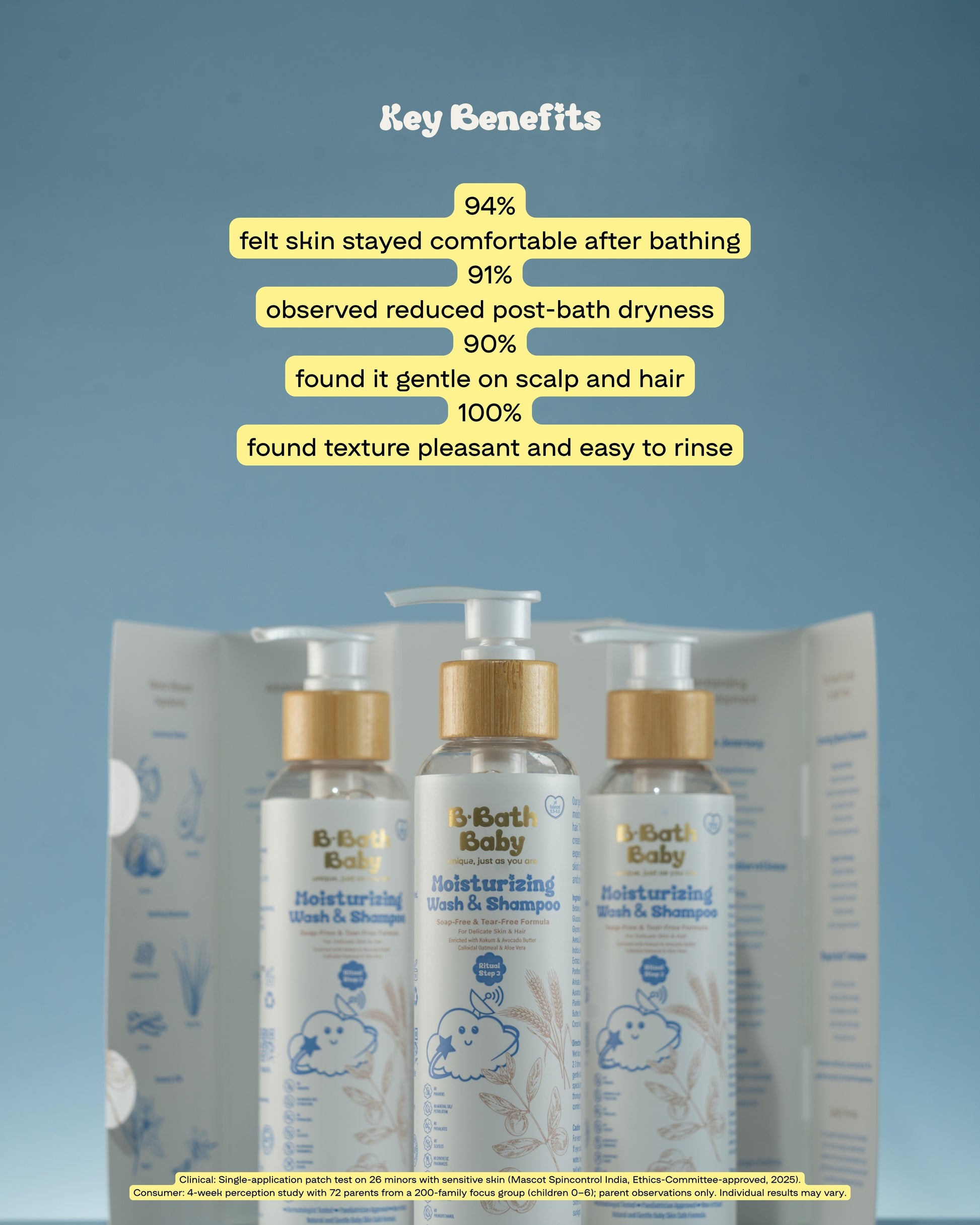 Neem and aloe vera juice help calm and purify, while D-Panthenol and cococin (coconut water extract) restore softness and shine to baby-fine hair. The blend of mild plant-based surfactants—Cocamidopropyl Betaine, Sodium Lauroyl Sarcosinate, Lauryl & Coco Glucosides—creates a creamy, low-foam lather that cleanses without drying.