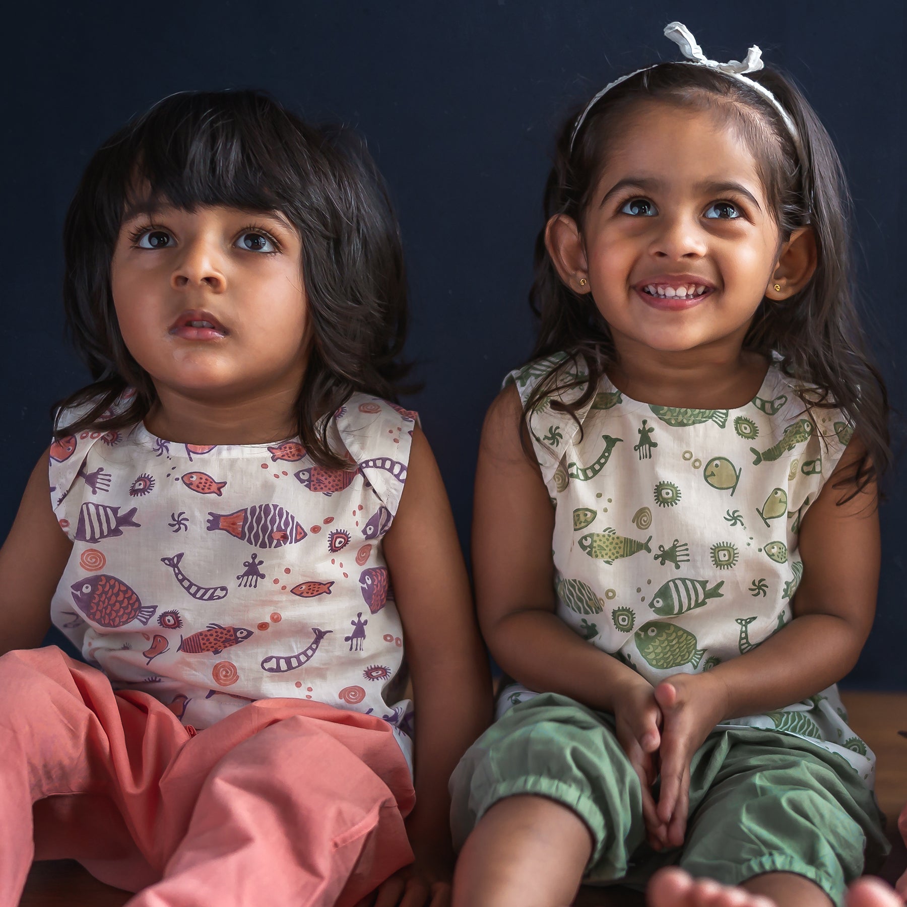 1 x jhabla top: 100% organic cotton sleeveless top with envelope neck for hassle-free wearing. All-over handblock printed fishes in shades of cool mint. 1 x pants: 100% organic cotton mint pants dyed with GOTS certified azo-free colours. Elasticated waistband and bottom hem. Sizes 2 years and above have side pockets and adjustable waist strings. Part of our Little Koi wants to fly poem collection. Conscious of minimising waste, the set is packed in a reusable muslin bag with an interactive paper game tag, ready for gifting.