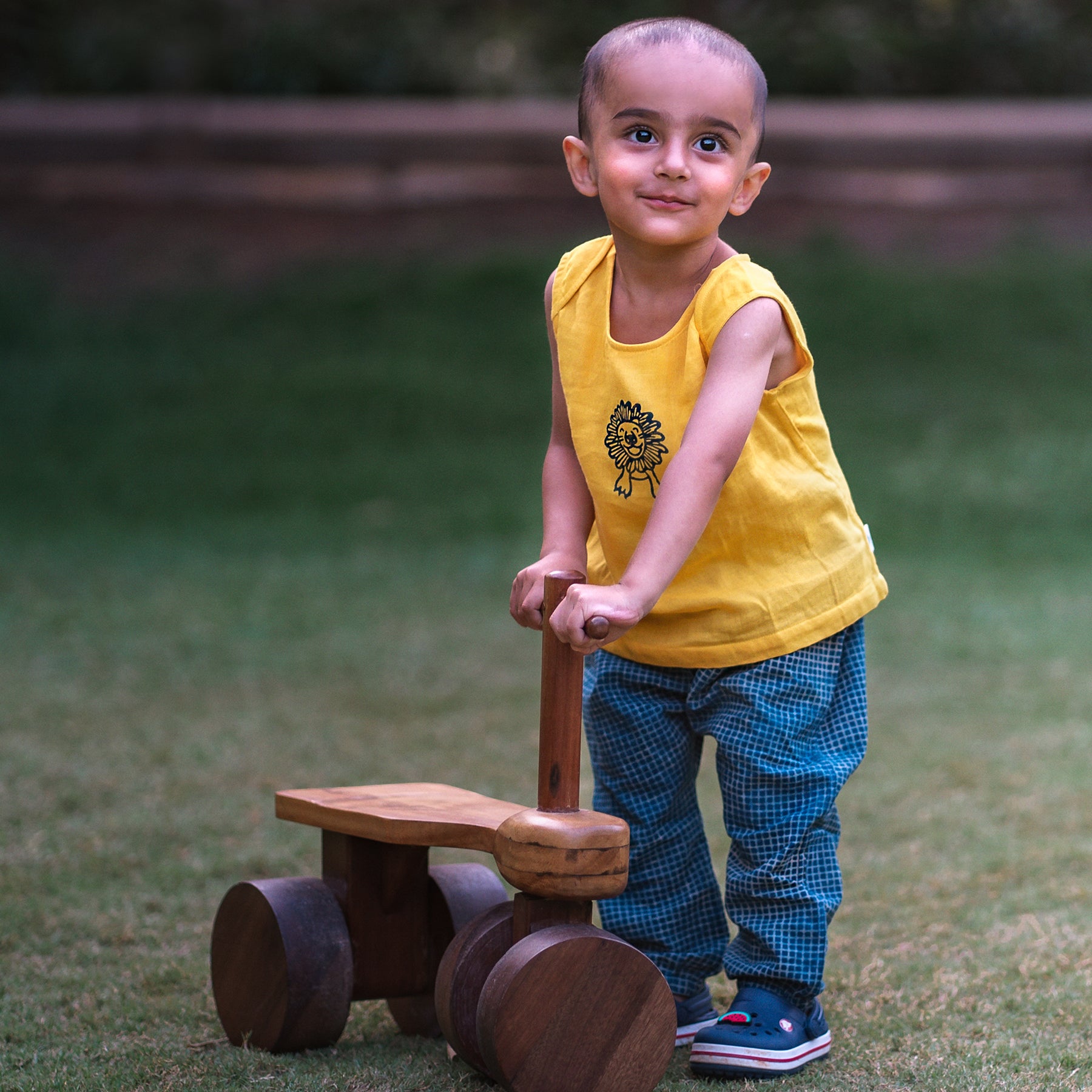 1 x jhabla top: 100% organic cotton sleeveless top with envelope neck for hassle-free wearing. Handblock printed with azo-free colours. 1 x angarakha top: 100% organic cotton hand block printed checks top created by traditional Ajrakh artisans in naturally hypoallergenic indigo colour. Tie-up closures and flat seams for ease of wearing and fit. Stitching detail on the neckline adds stability and aesthetic value. 1 x pants: 100% organic cotton. Handblock printed indigo checks pants by traditional Ajrakh artisans. Elasticated waistband and bottom hem. Part of our Zoo Treat collection. Conscious of minimising waste, the set is packed in a reusable muslin bag with an interactive paper game tag, ready for gifting.