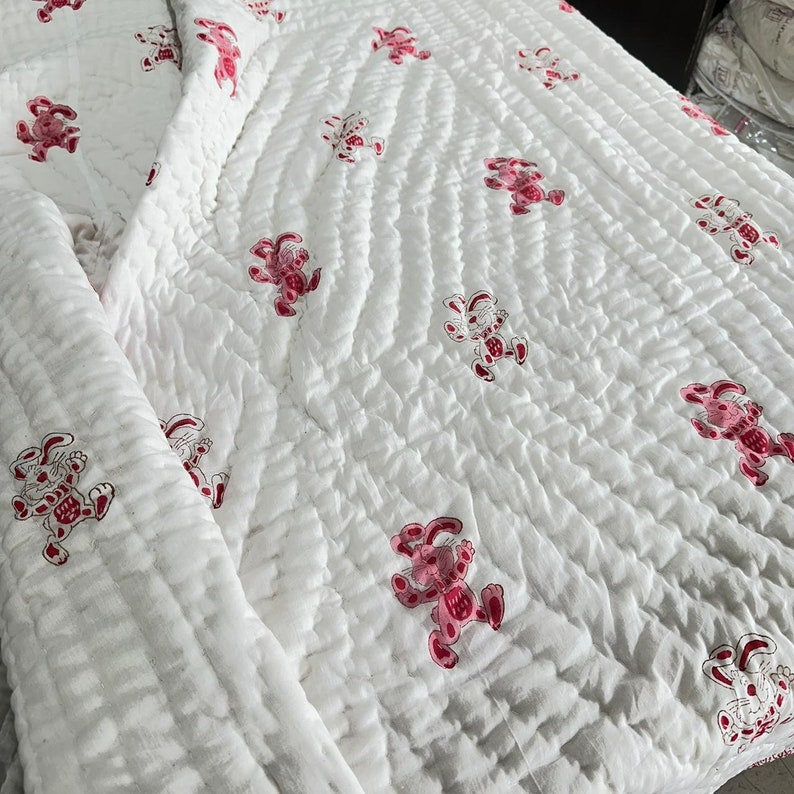 Our products are handblock printed on 100% premium cotton. Organic cotton filling used. Handcrafted in India using low impact dyes and breathable fabrics.
