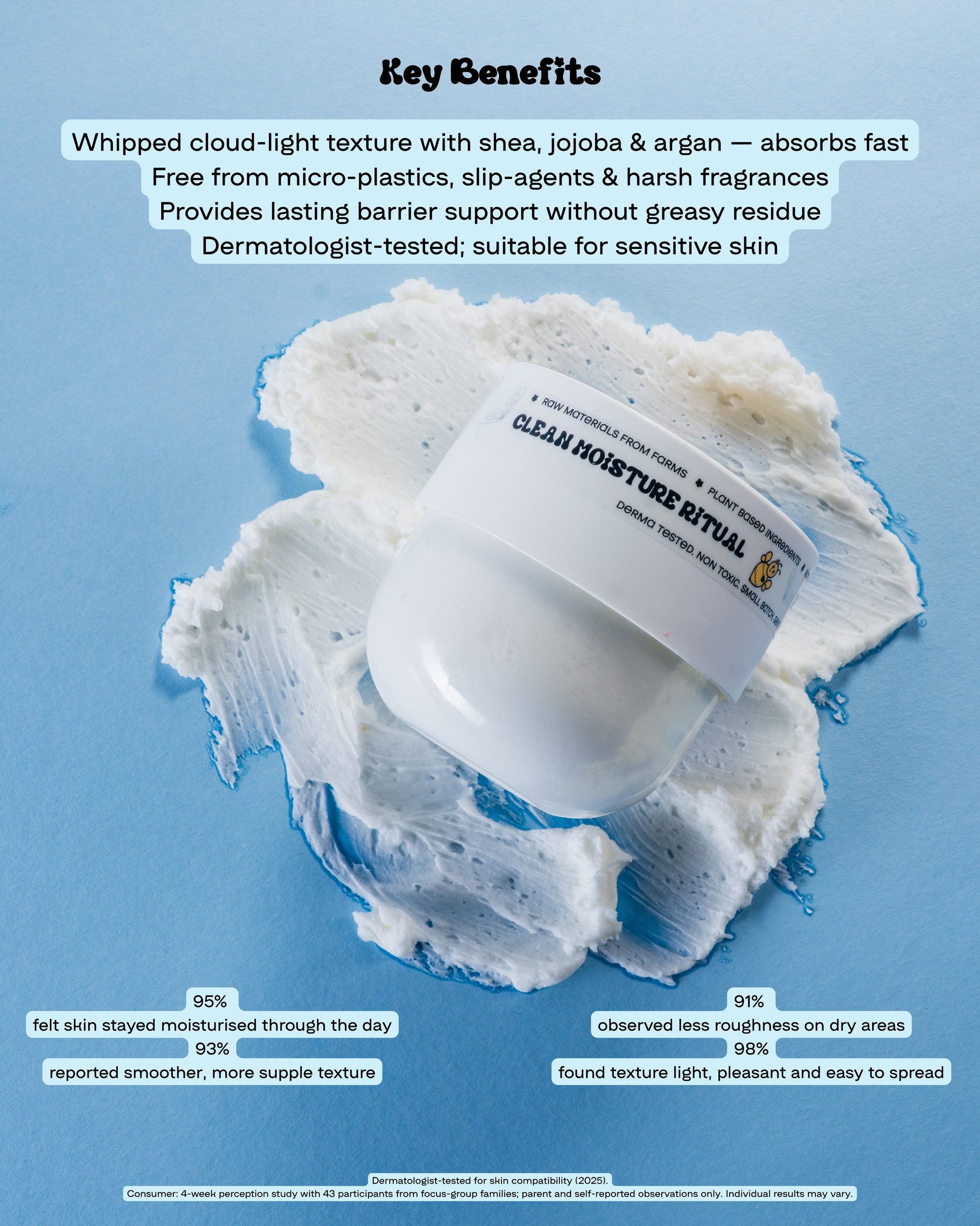 The lightweight formula absorbs quickly despite its rich appearance, delivering lasting hydration and leaving skin feeling incredibly soft with a subtle, comforting scent.
