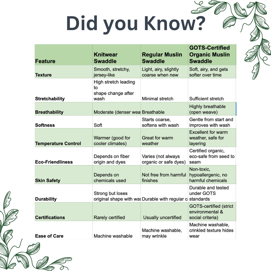 - Natural and Chemical-Free - Our organic cotton swaddles are GOTS certified, ensuring they’re free from harsh chemicals, toxins, and synthetic dyes.