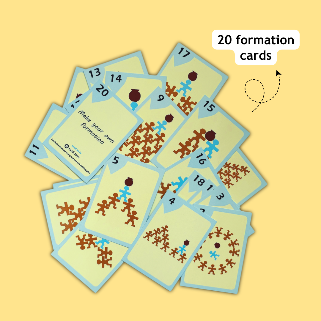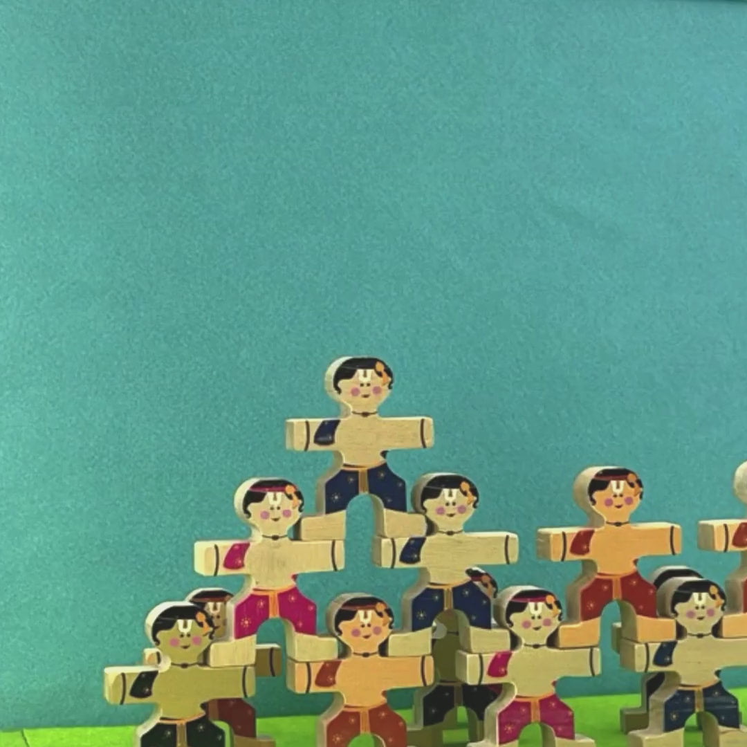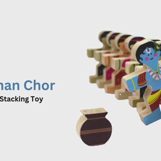 Makhan Chor is a figurine stacking toy based on the Indian festival of “Dahi handi”, the festive tradition of forming human pyramids to reach and break a pot of curd.
