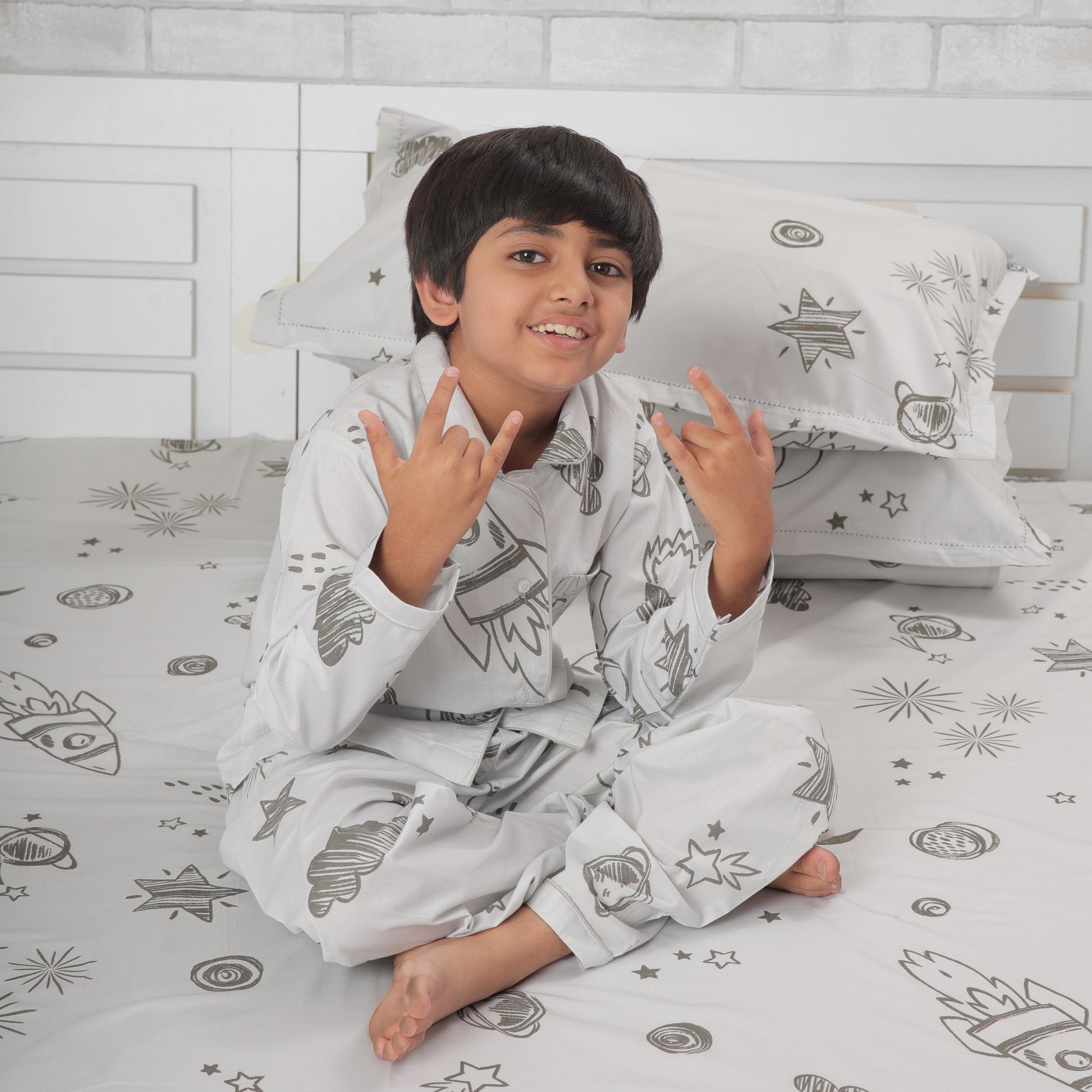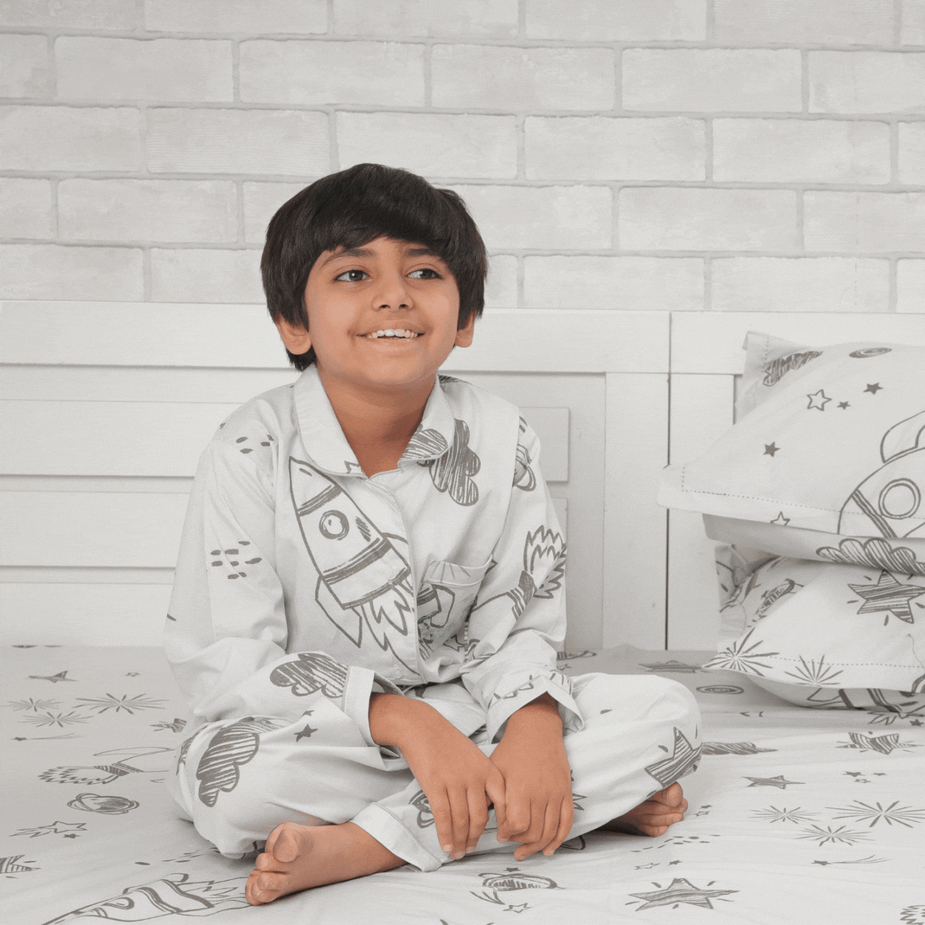 Let your little one explore the wonders of the night sky with this "To The Moon And Beyond" night suit. Your little dreamer will be amazed by the captivating hand-drawn Glow-in-The-Dark designs. Say goodbye to boring bedtimes!