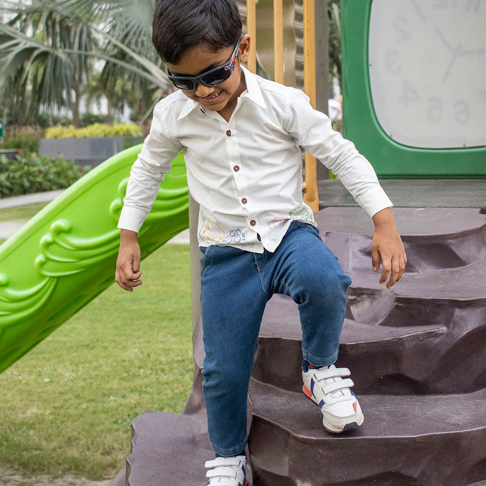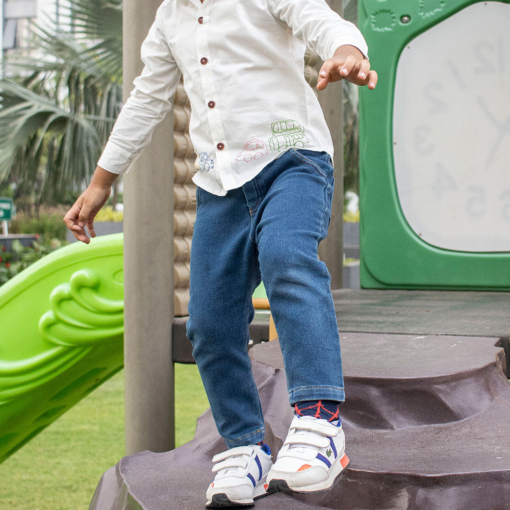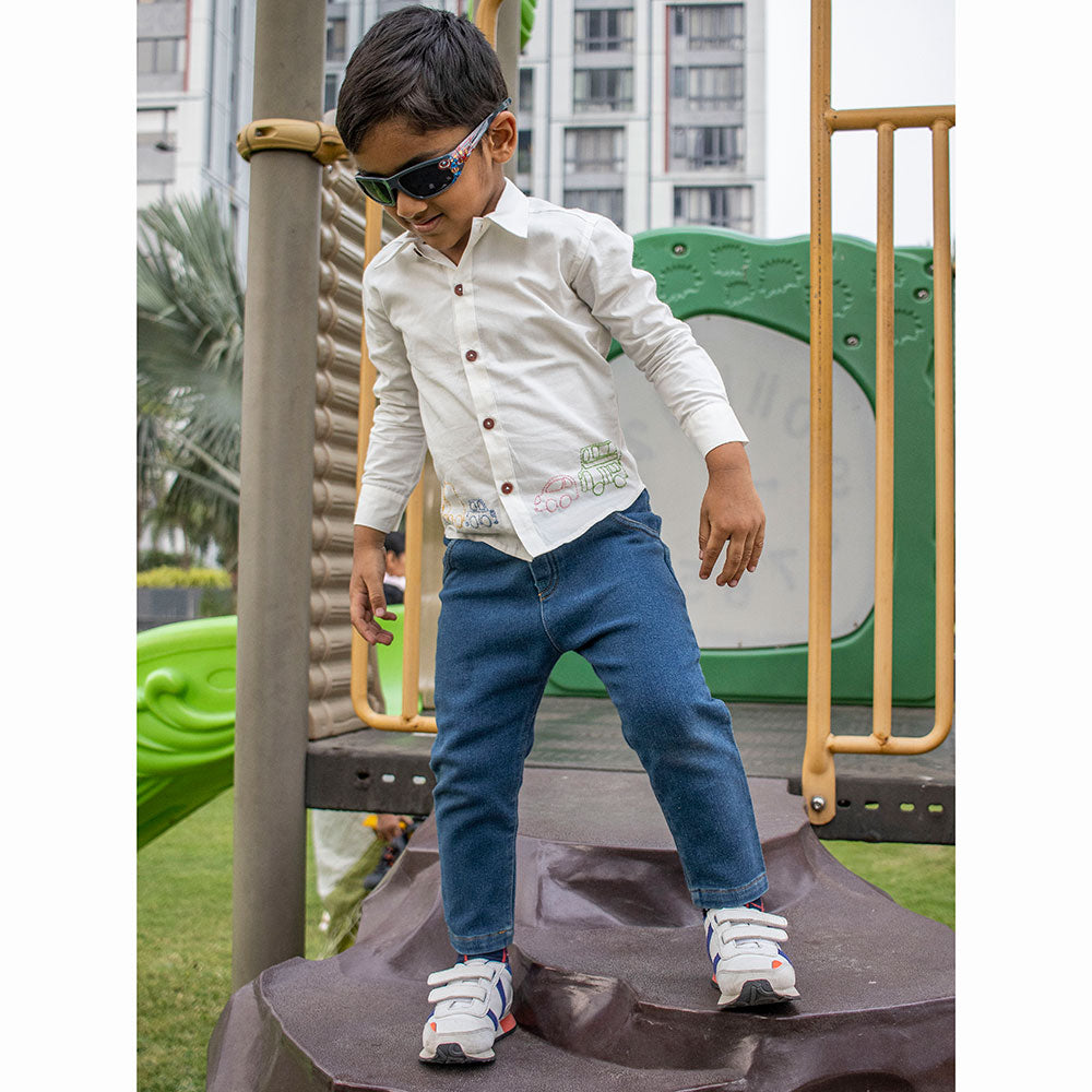 Our classic Frost shirt with an embroidered multi coloured vehicles at a traffic signal design will surely be your little ones new favourite for casual parties. Roll up the sleeves or keep them crisp straight, jeans or trousers, stylize it your way for a casual outings or a day party. Designed with a shirt collar, button placket and long sleeves, this shirt is made of 100% organic cotton for uber comfort.