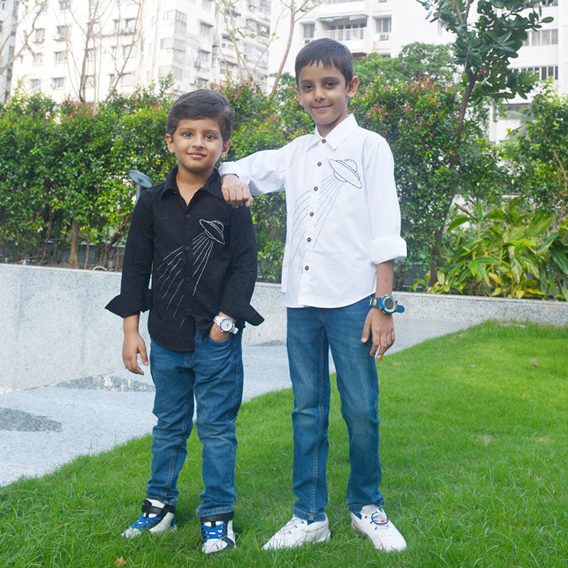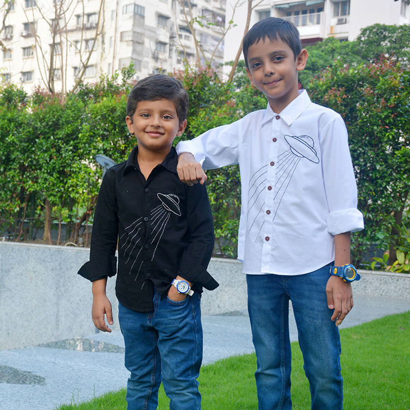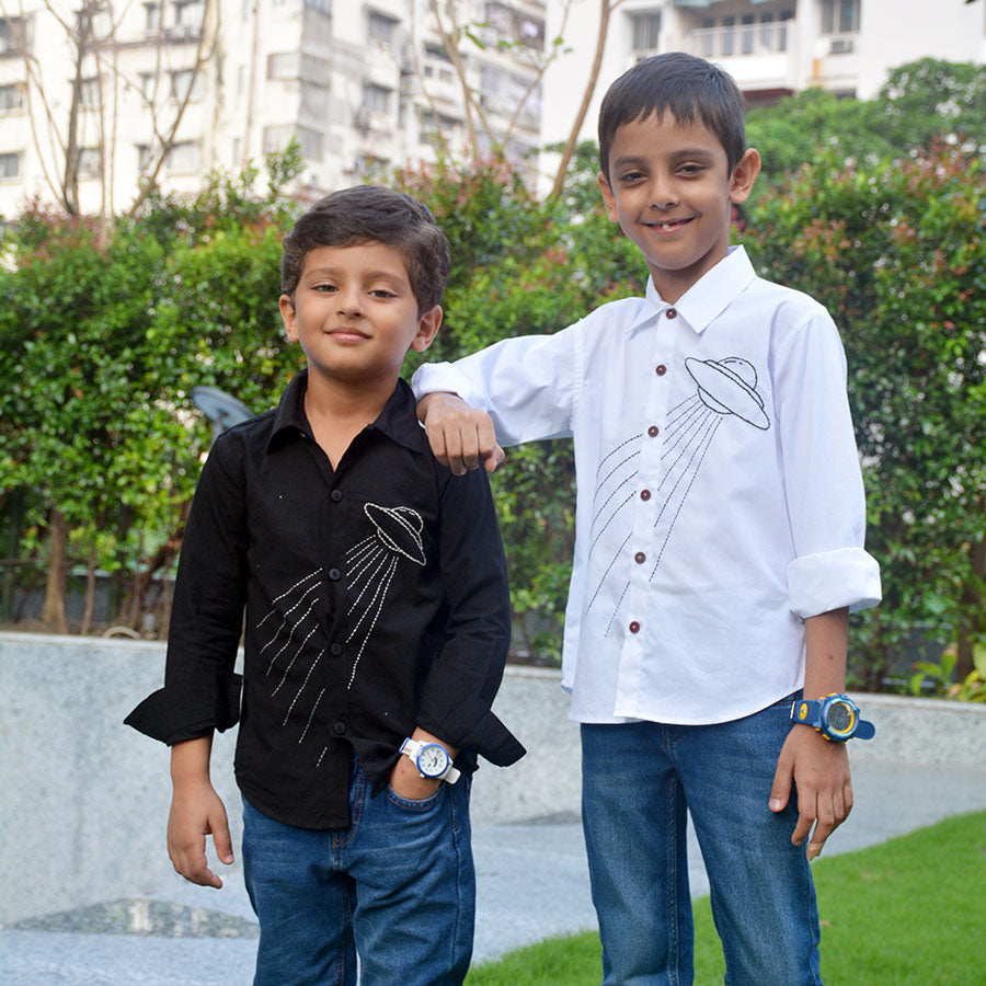 An UFO is shining down on Earth and is about to land! Are you ready? A classic monochrome shirt in white & black - stylize it with trousers, or roll up the sleeves & team it with denims or shorts for a smart-casual look. Made from high-quality, breathable organic cotton fabric, this shirt ensures comfort for your child.ξ