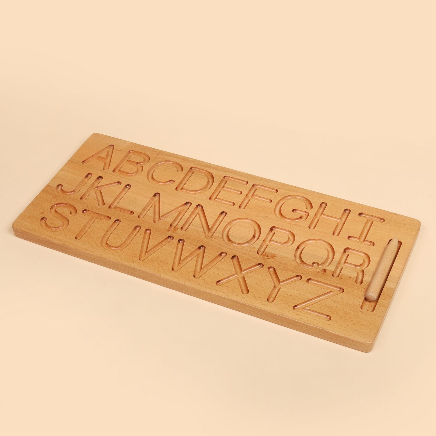 Our Montessori Educational Toy alphabet board is an excellent tool to introduce your child to the world of letters and writing. With smooth curved grooves, it allows little hands to trace letters using their fingers or the included wooden pencil. This hands-on learning experience is perfect for developing fine motor skills and strengthening muscle memory, making the transition to writing on paper much easier. The board is double-sided, with one side featuring uppercase letters and the other side engraved with lowercase letters. This thoughtful design encourages recognition of both letter forms, supporting early literacy development. Crafted from solid wood, it’s durable, eco-friendly, and safe for children. Natural wood grains and textures ensure each piece has its own unique character. This Montessori Educational Toy also offers endless opportunities for creative play. Children can trace the letters, fill the grooves with small objects like pebbles or beads, or use crayons for letter rubbings. It’s a wonderful tool for sound recognition games or letter-matching activities, adding excitement to every learning session. You will receive: One reversible alphabet board (uppercase and lowercase letters) One wooden pencil for tracing Give your child a solid foundation in reading and writing with this beautifully crafted educational toy.