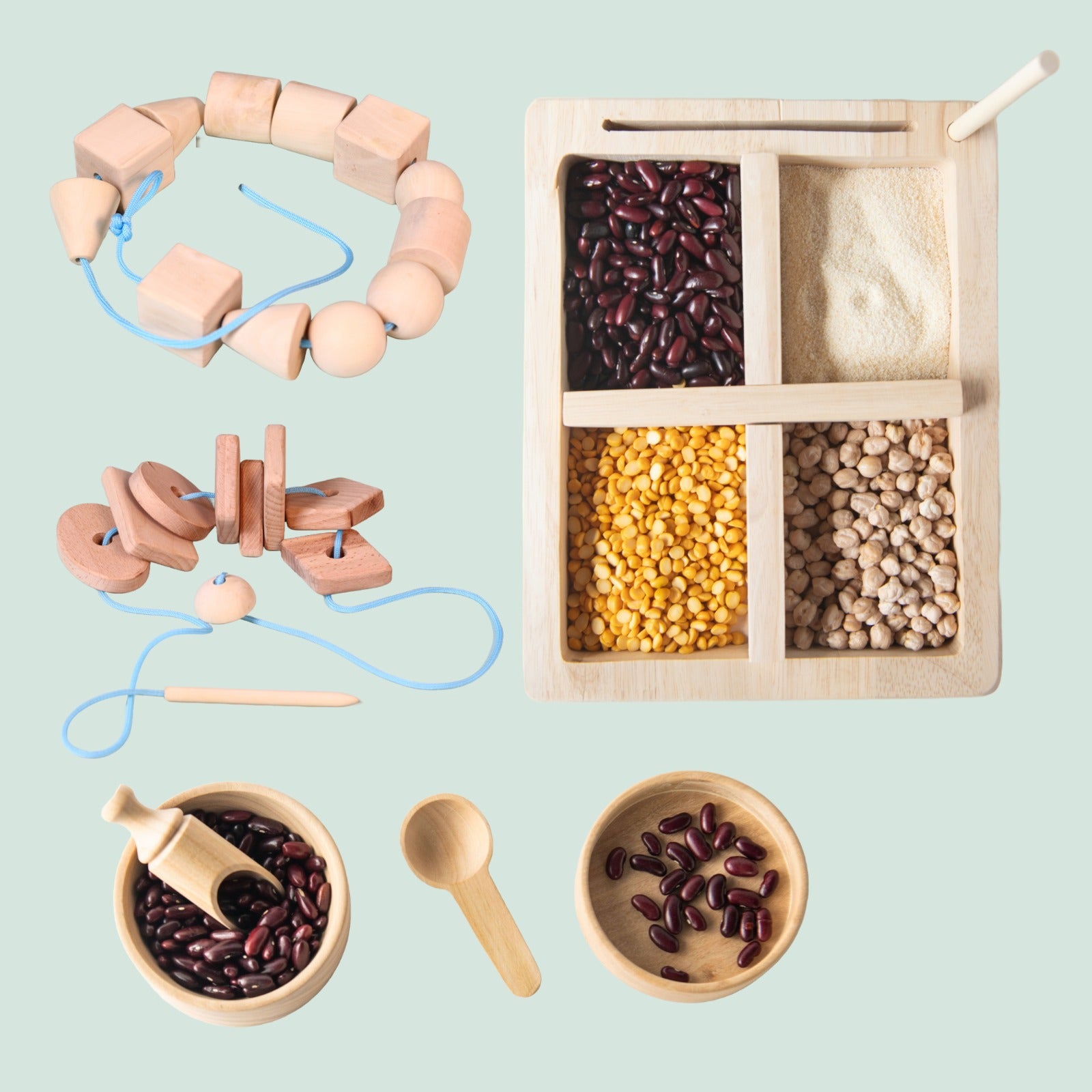 Montessori Bowls and Montessori tray and sorter. The Lacing Beads strengthen hand muscles, enhance hand-eye coordination, and foster bilateral coordination, while also improving focus and building patience.