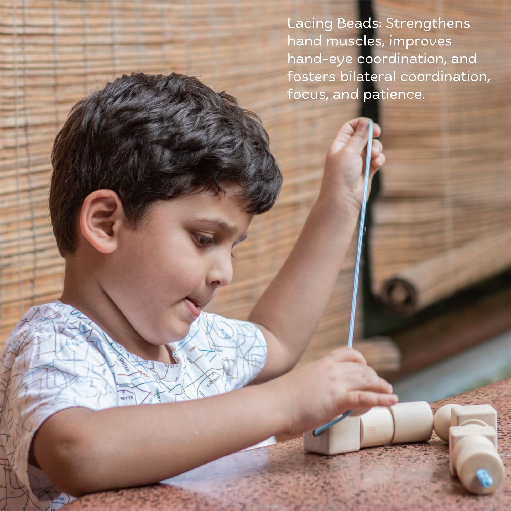 Why Choose our Lacing Beads? Strengthens Hand Muscles: Grasping different shaped beads strengthens hand muscles. Develops Hand-eye Coordination: Visually tracking hand movements while lacing improves coordination. Enhances Bilateral Coordination: Coordinating both hands together fosters bilateral coordination for future tasks. Improves Focus: Engaging with lacing beads enhances attention and focus. Builds Patience: Encourages patience and perseverance during play.