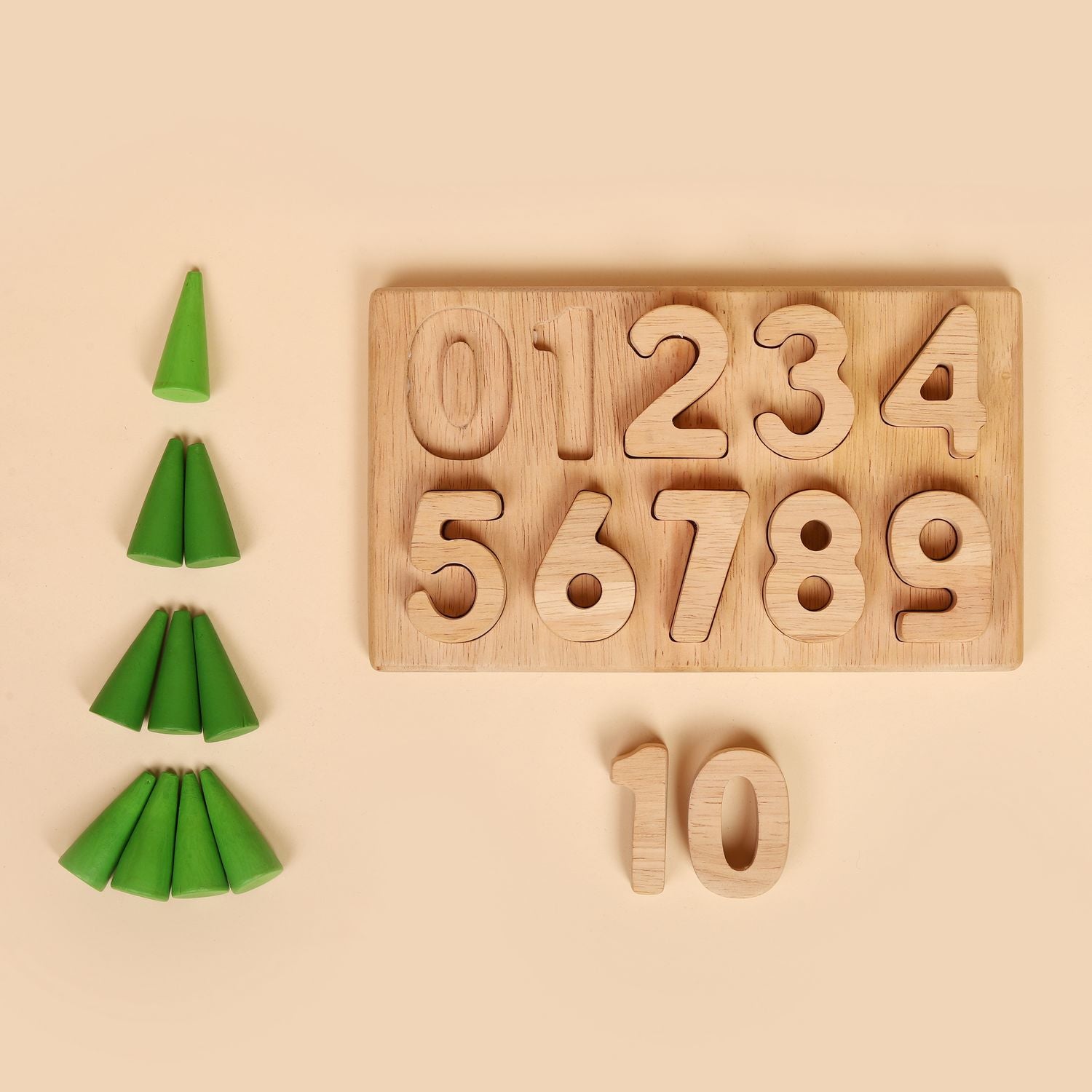 The 0-9 Numbers Puzzle is a thoughtfully designed Montessori Educational Toy that introduces children to numbers in an engaging and hands-on way. Crafted from natural materials, it features a smooth wooden base with perfectly fitted number pieces. Each number, from 0 to 9, has a unique shape that children can explore by tracing and fitting it into its corresponding space. The tactile experience enhances their understanding of numerical concepts, promoting both cognitive and fine motor skill development. The puzzle is not just a toy but a powerful learning tool which upon using alongside a book or with loose parts like pebbles, beads, or seeds encourages extended learning and interactive play. Children can explore number recognition, counting, and basic math operations, making it a versatile addition to their educational playtime. The carved-out numbers are ideal for finger tracing, providing a multisensory experience that strengthens early math foundations. Designed for both independent and guided learning, this Montessori Educational Toy fosters curiosity and builds problem-solving skills. It’s perfect for preschoolers, homeschooling setups, and classroom environments. The natural wood finish, rounded edges, and child-safe materials ensure a safe and enjoyable playtime experience. You will receive: 1 Wooden Board with numbers from 0 to 9
