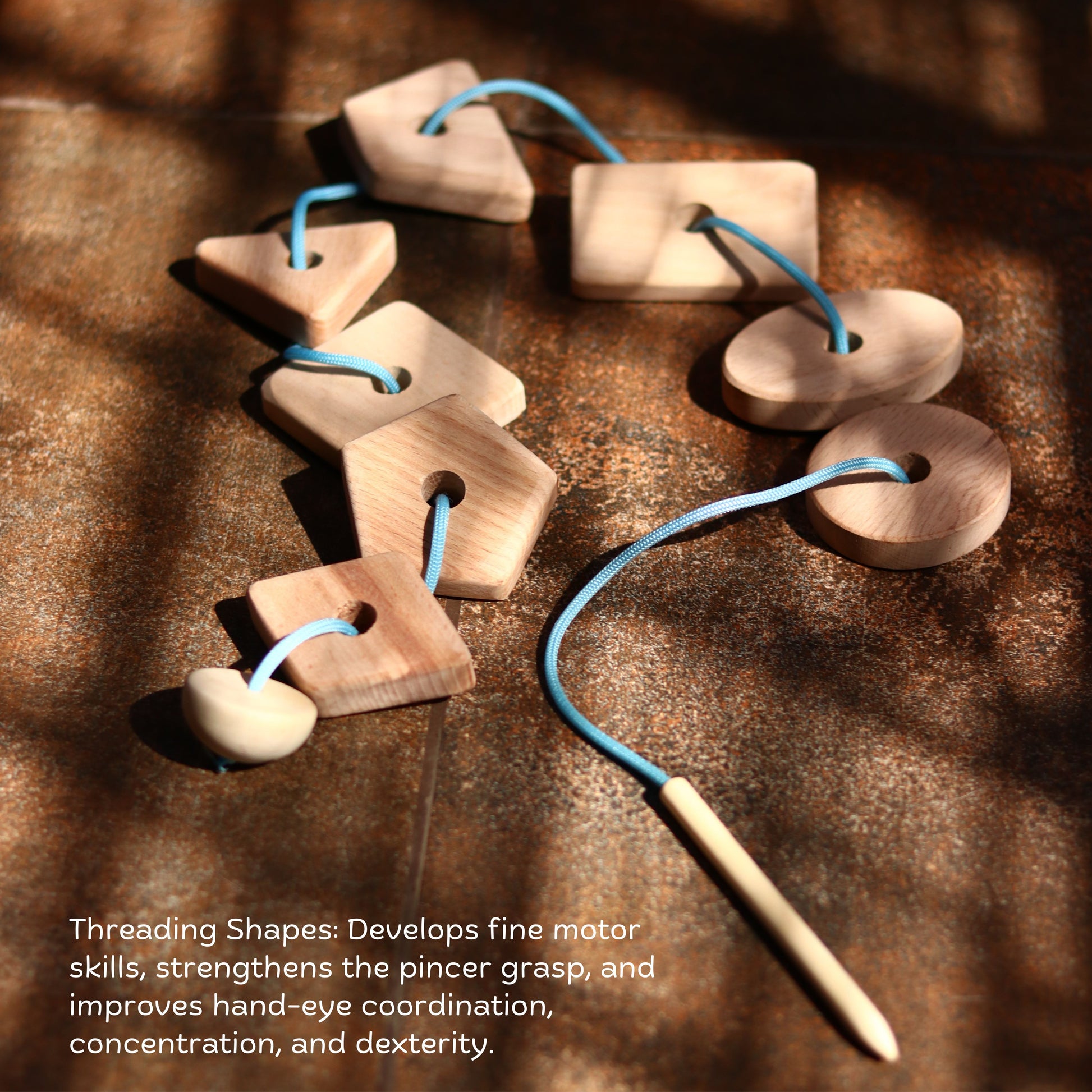 The Threading Shapes toy promotes fine motor skill development,